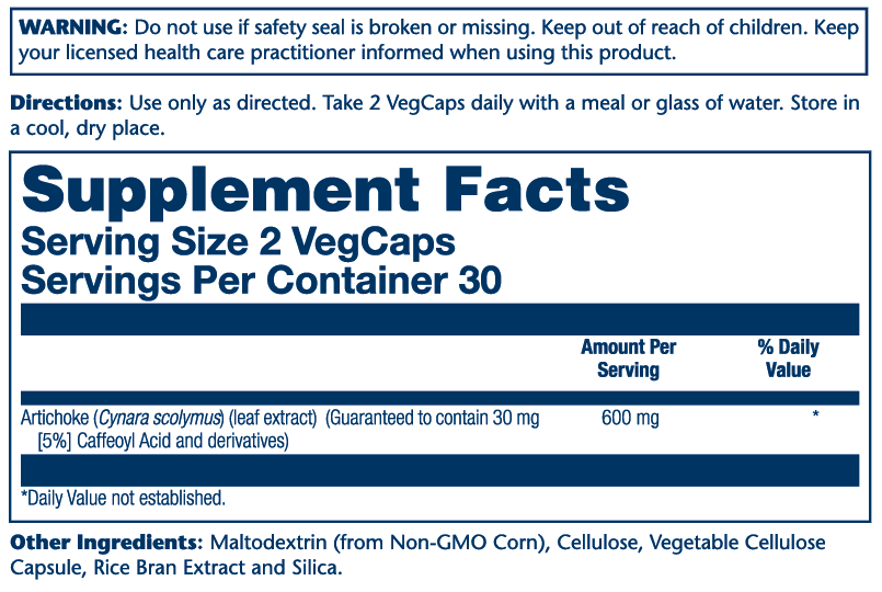 Our Artichoke leaf extract has a guaranteed potency of 50 mg (5%) Caffeoyl Acid and derivatives in 600 mg Artichoke lea extract. Also known for cynarine, which has demonstrated Liver tonic properties similar to milk thistle.