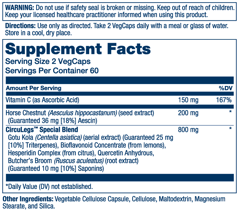 - CircuLegsTM Special Blend features gotu kola, bioflavonoid concentrate from lemons, hesperidin complex from citrus, quercetin anhydrous, and butcher’s broom