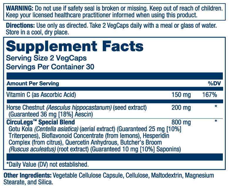 Horse chestnut is a tree native to parts of southeastern Europe. Its fruit contains seeds that offer powerful wellness support.* This expert formula includes vitamin C and a CircuLegsTM Special Blend to support overall well-being.*