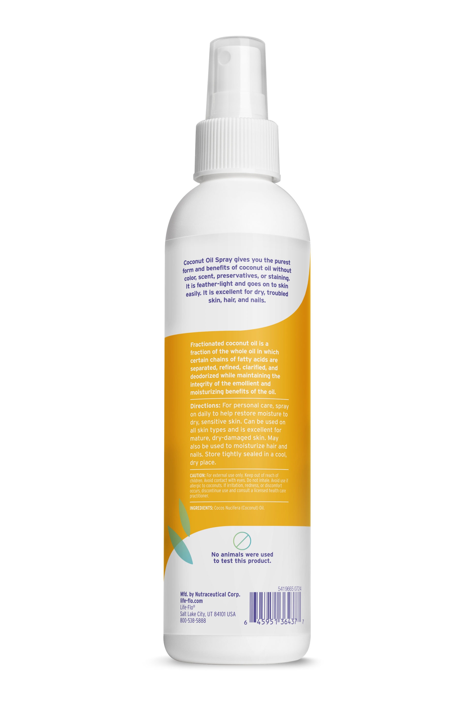 Life-flo Coconut Oil Spray is 100% coconut oil that has been fractionated for better absorption and a lighter consistency. During fractionation, certain chains of fatty – medium chain triglycerides – are separated, refined and clarified. This process preserves the oil’s integrity while rendering a product that is feather-light, fast-absorbing and liquid at room temperature.
