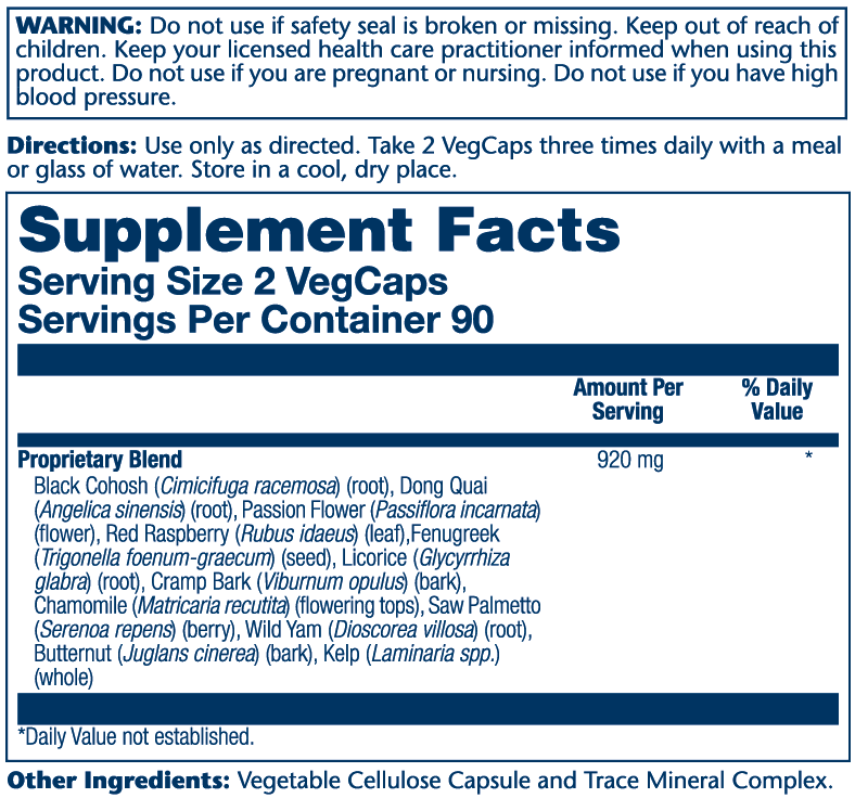 Our special blend also includes passion flower, red raspberry, fenugreek, licorice, cramp bark, chamomile, saw palmetto, wild yam, butternut & kelp along with added mineral salts for increased support.
