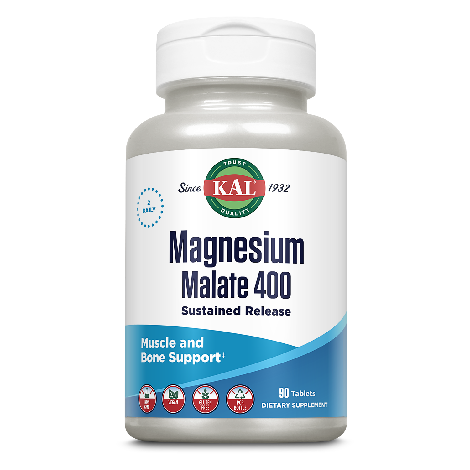 Produced in our own facility, KAL Magnesium Malate is made by reacting the mineral Magnesium with Malic Acid. Malate is a key nutrient in the Krebs cycle. This meticulous process produces high-quality Magnesium, chelated and highly bioavailable. KAL Magnesium Malate 400 tablets provide 400 mg Magnesium per serving (2 tablets).