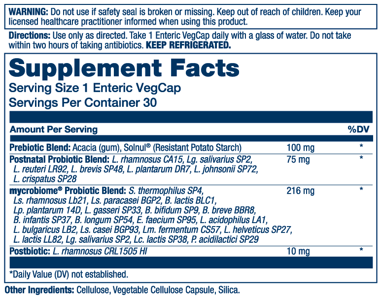 - 3-in-1 formula with clinically studied ingredients includes prebiotics, probiotics + a postbiotic for complete microbiome support*