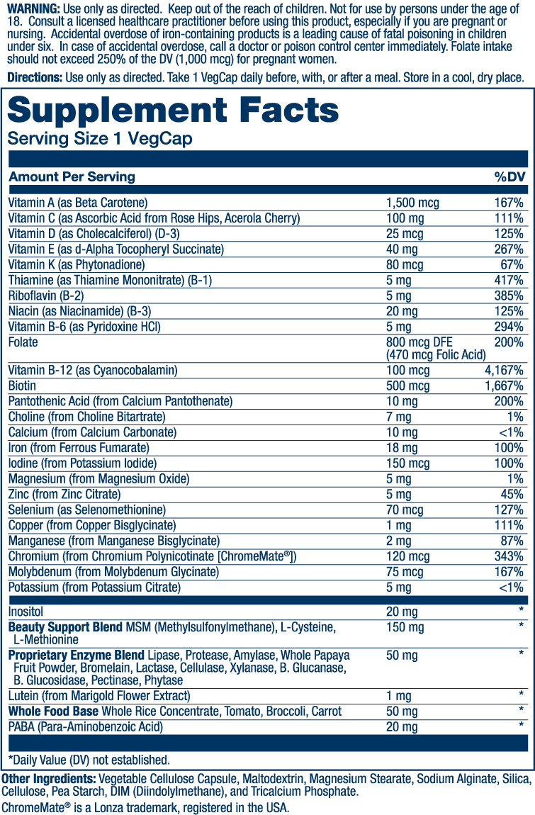- With vitamins A–K, including all 8 essential Bs, plus 100% DV of iron to support the body’s natural production of red blood cells*