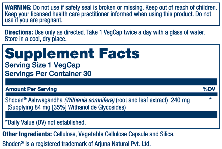 - With 240 mg clinically studied Shoden® Ashwagandha supplying 84 mg (35%) withanolide glycosides, the herb’s beneficial compounds