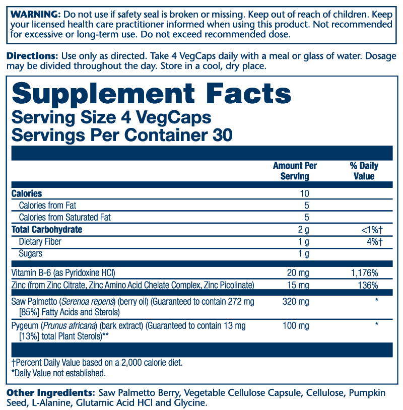 Made for men’s health: Saw palmetto is a small tree that produces potent berries whose extract provides male urinary support.* This formula includes pygeum bark extract for prostate support, plus zinc to support the immune system, skin and muscle health, and male reproductive health.*