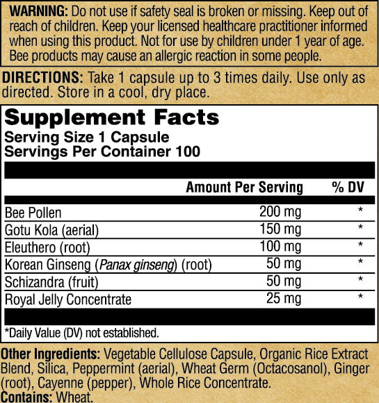 Boost from the hive: This powerful formula blends bee pollen and organic royal jelly with time-honored herbs like gotu kola, eleuthero, Korean ginseng, and schizandra—plus a warming touch of peppermint, ginger, and cayenne.