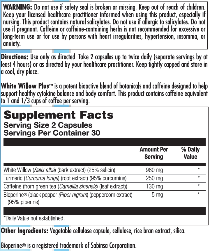 White willow extract with guaranteed 25% salicin content plus caffeine and piperine designed to help support cytokine balance and body comfort*
